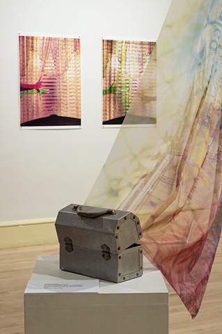 Natalie Hunter. In The Shadow of Rust 02. Colour photograph on sheer polyester, steel lunch pail belonging to the artist's father. 36" x 88".