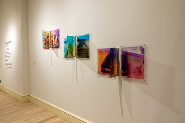 Natalie Hunter. Selections from Of Rust and Rays. 2024. Archival pigment prints on transparent film, hand shaped birch, hand cast and tinted resin, colour reflective film, magnets, UV varnish, light.