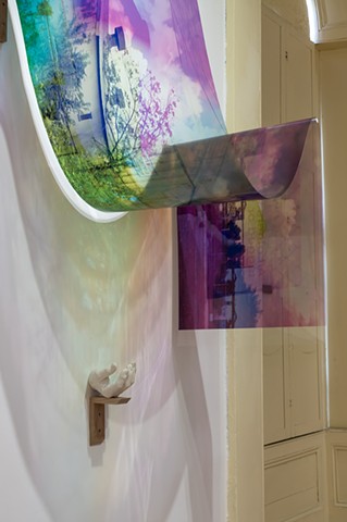 Natalie Hunter. In The Shadow of Rust 01. Two Archival pigment prints on transparent film draped over hand turned aluminum and birch armatures, hand cast gypsum, light.